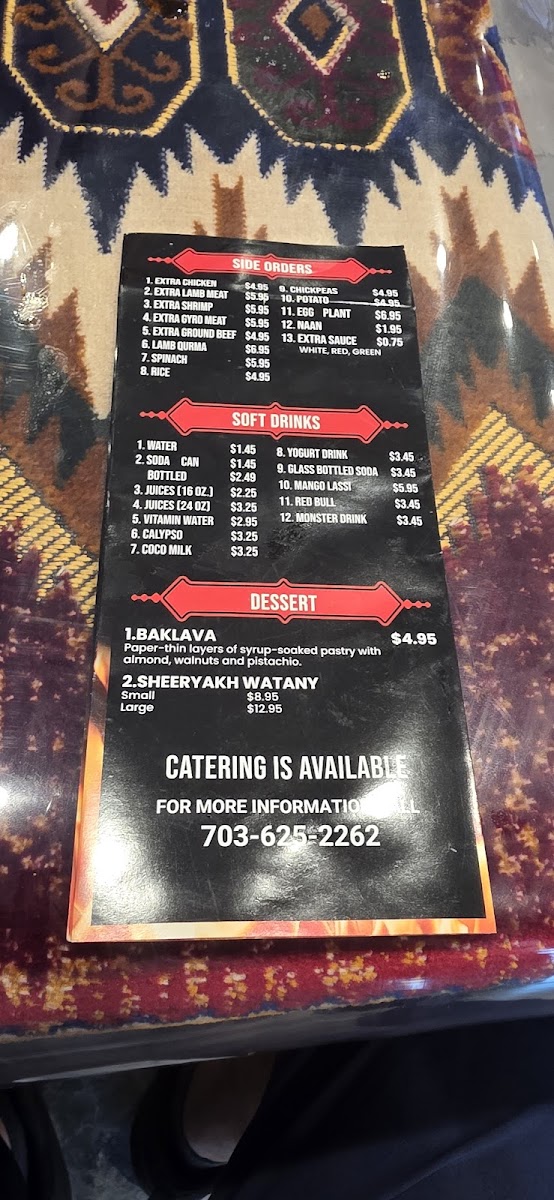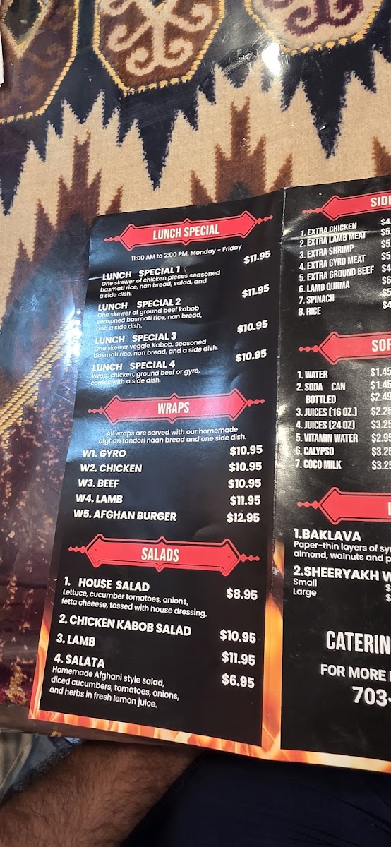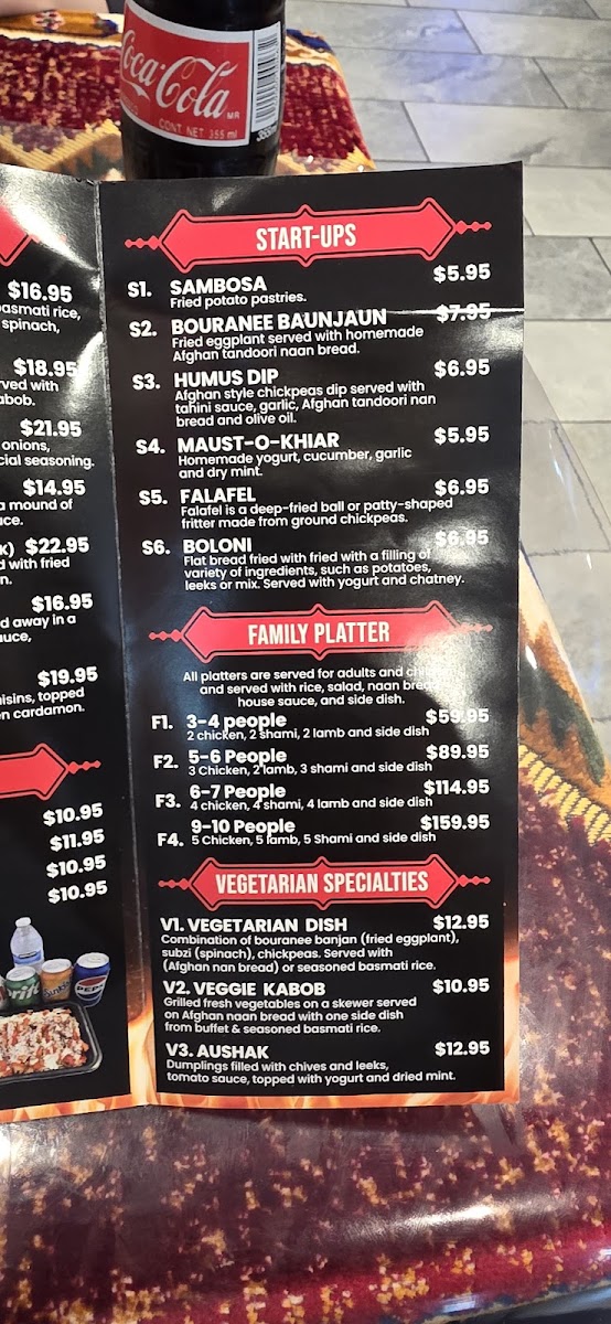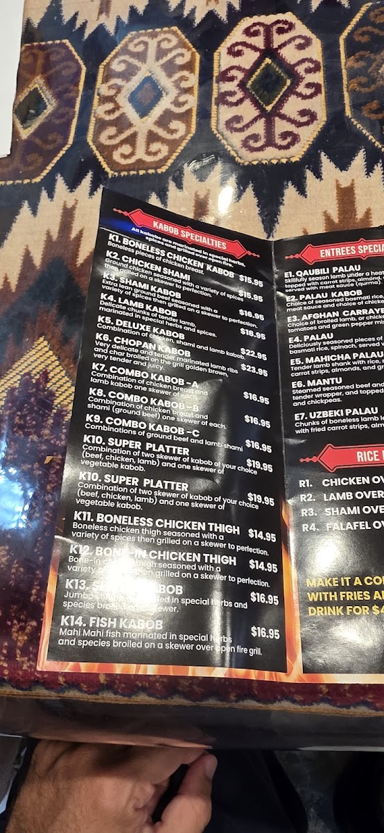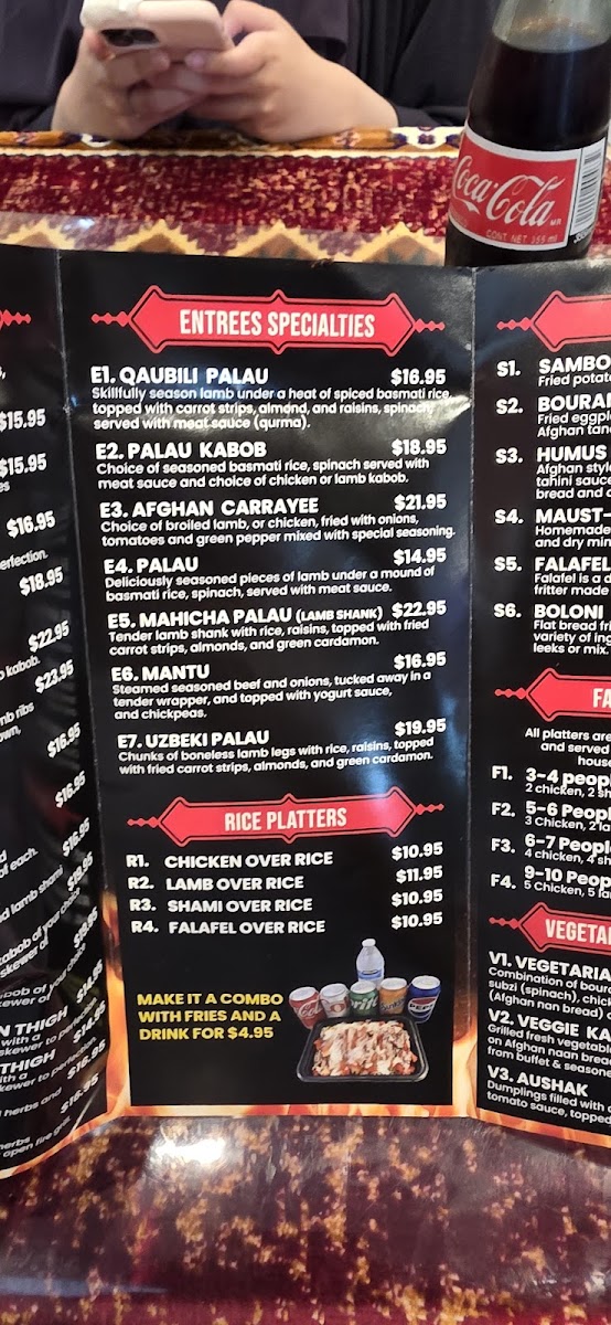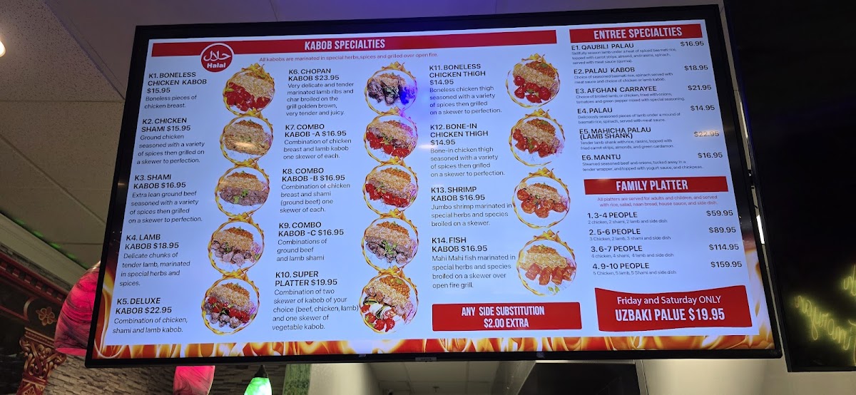 2. Chicken, 2. Shami, 2. Lamb served with rice, afghan nan bread, 2. Sides, Salad and green Chatny sauce.